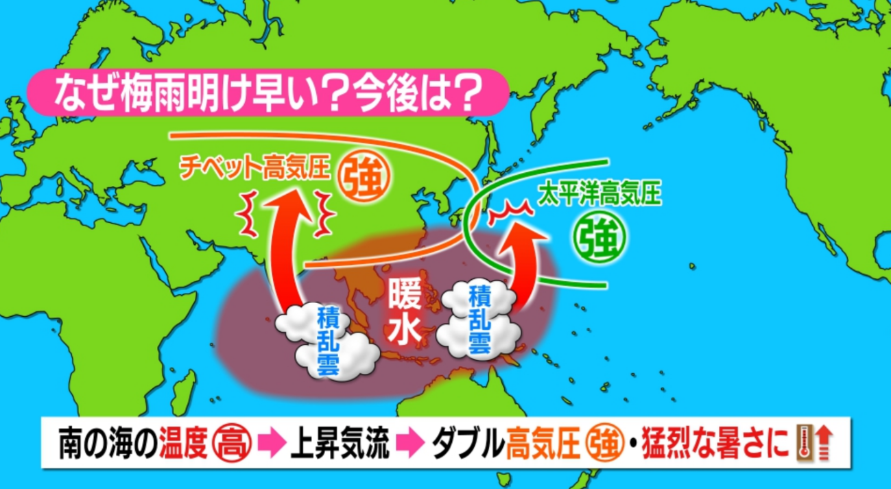 通常、7月中旬頃から太平洋高気圧の張り出しが本格的に強まり日本列島がすっぽり覆われるタイミングで梅雨明けが発表されます。それが今年は早いのです。