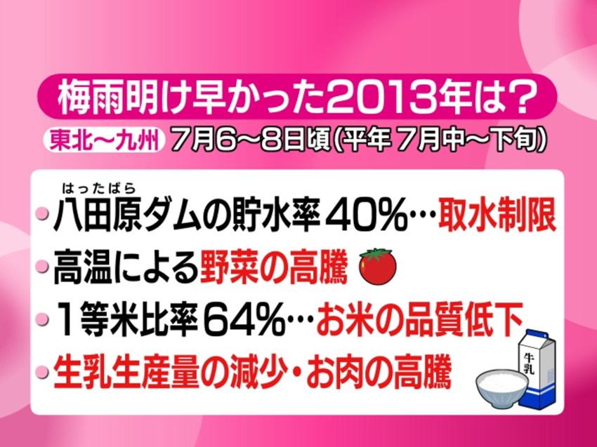 こちらは2013年の例です。この年も各地で平年よりも10日くらい早い梅雨明けの発表となり、厳しい暑さの夏となった年でした。
