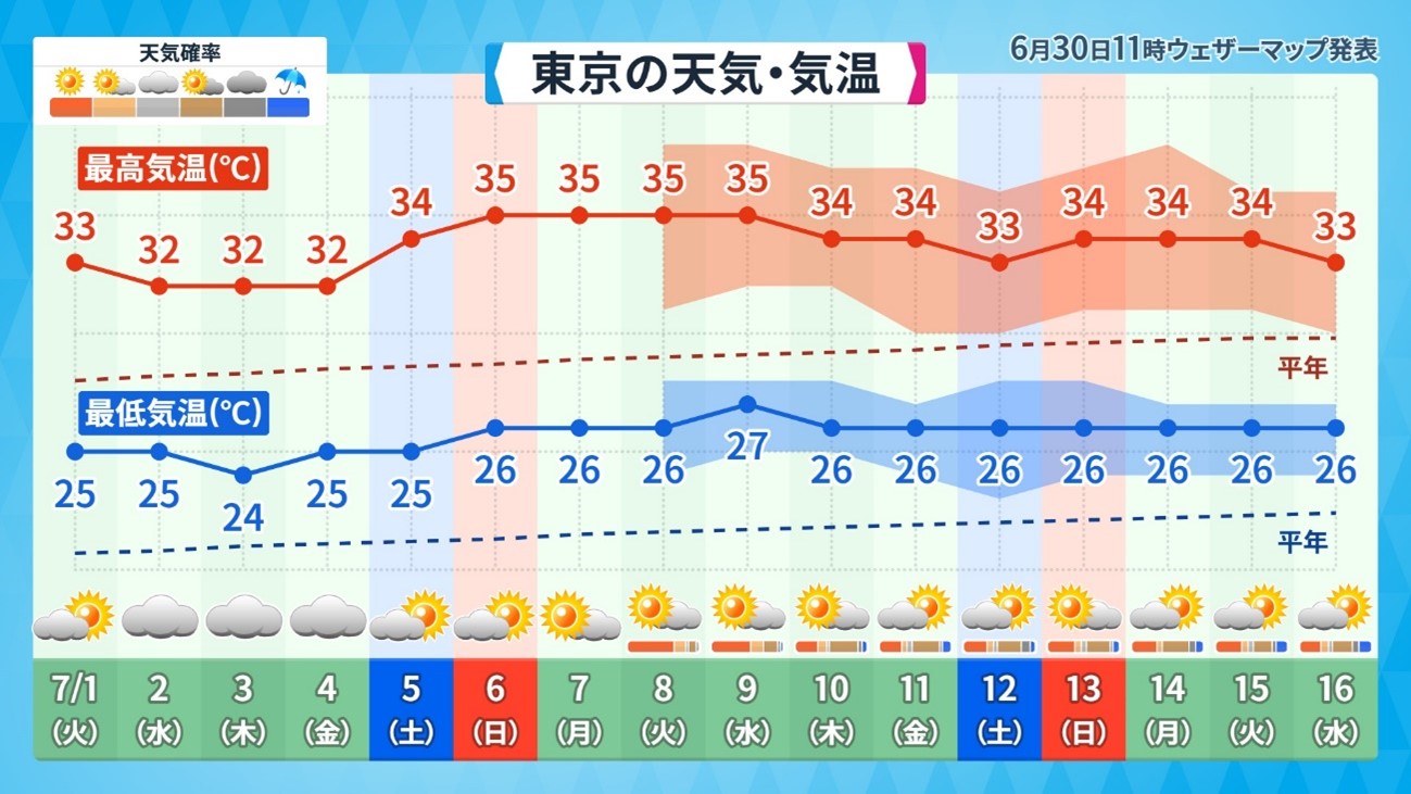 ウェザーマップ独自の16日予想で見ていきます。東日本の梅雨明けはまだされていませんが、5日以降に発表される可能性がありそうです。全体的には晴れる日が続き、戻り梅雨がなさそうな雰囲気ですが、念のため油断はできません。