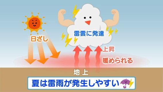 夏の強い日差しが照りつけると、地上の空気が暖められ上昇流が起き、局地的に激しい雷雨となる事があります。ぜひお天気マークに注目して下さい。