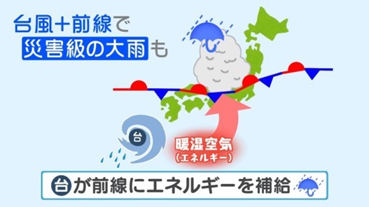 こうした前線と台風による大雨災害は、今月再び起こってもおかしくありません。念のため、この天気図は大雨パターンだと記憶の片隅に置いて頂けたらと思います。