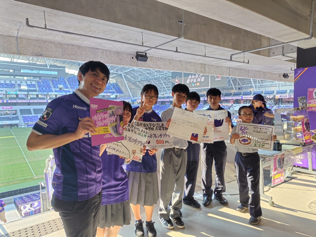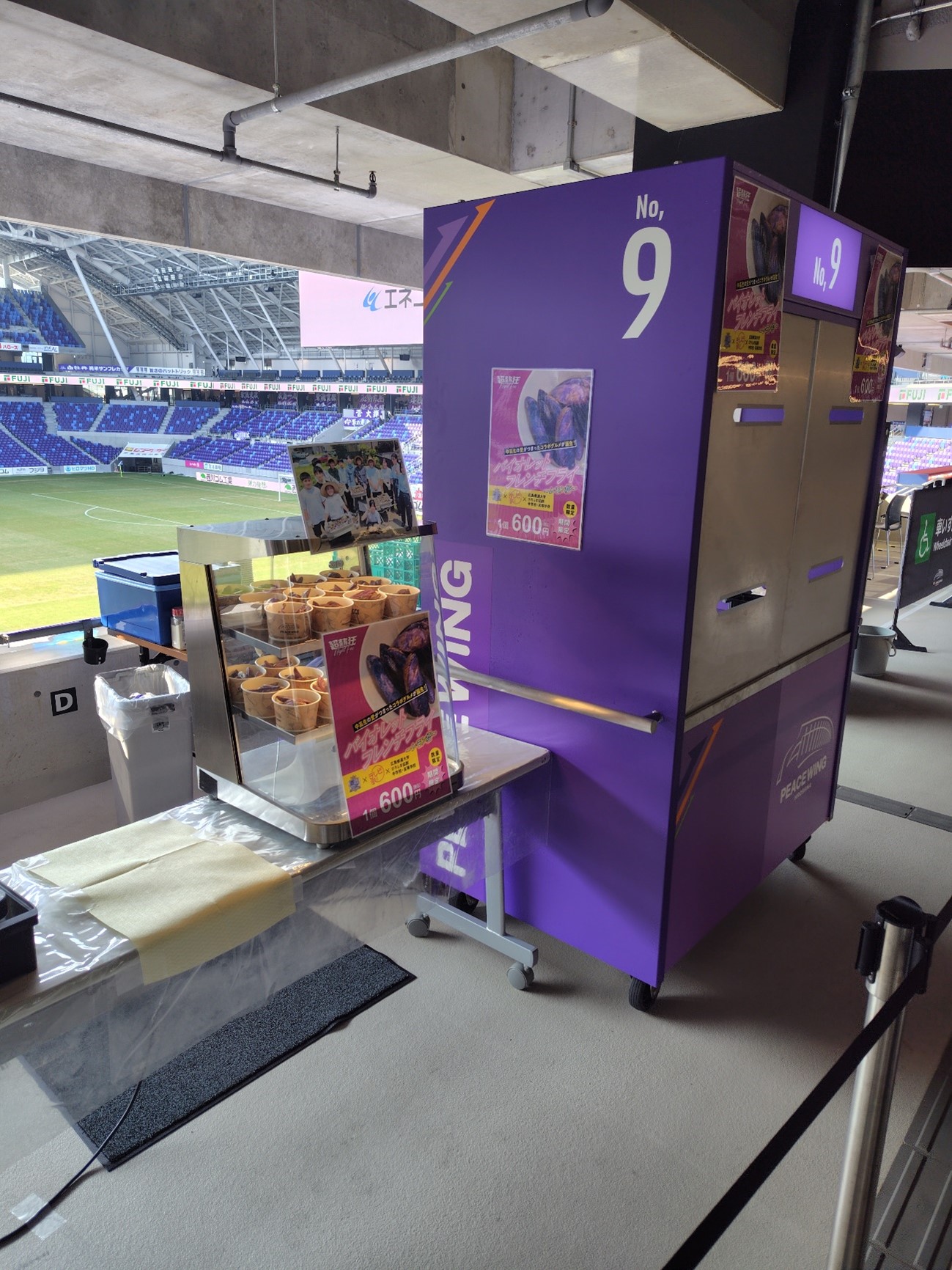 先月の続きです。私が担当しているテレビ派ふぁーむのコーナーと、広島修道大学ひろしま協創中学校・高等学校が一緒に作ったシャドークイーン(紫のジャガイモ)のコラボ企画ですが、ついに、先月8月20日エディオンピースウィング広島のスタジアムグルメに商品が登場しました。