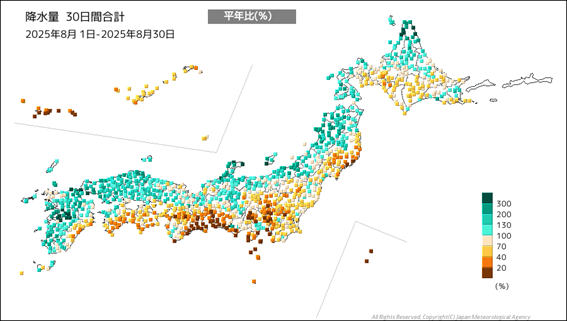 北海道から西日本の日本海側では低気圧や前線の影響で平年比100%以上と雨が多く降った一方、太平洋側は70%以下と雨量が少ない地域が目立つ状況となりました。三重や愛知などでは20%以下の地域も出ています。