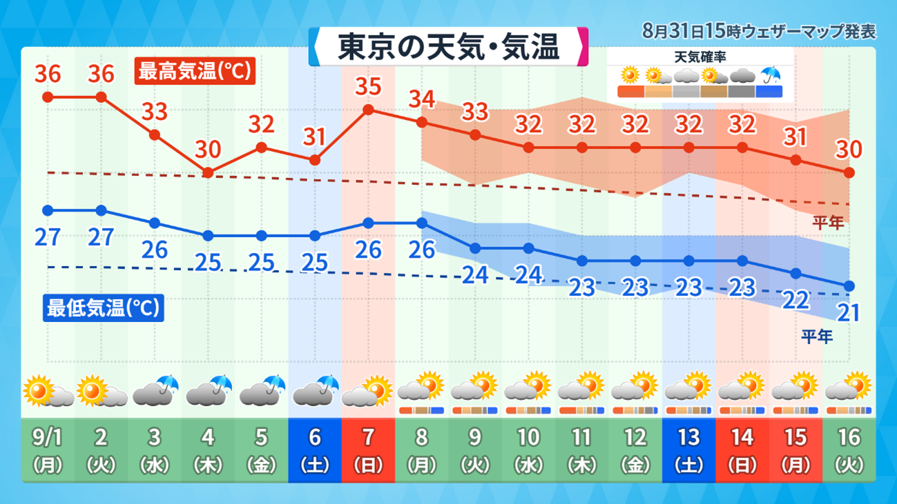 ウェザーマップ独自の16日予報で、東京を見てみます。日中30℃以上の厳し暑さが続く見込みです。