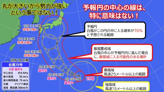 ポイント2は、予報円の中心線は、ただ円の真ん中を結んでいるだけで特に意味はありません。予報円は台風の中心がその範囲に入る確率が70%、さらに円は大きくなるだけ予想がぶれてどこに行くかわからないといった意味合いなのです。