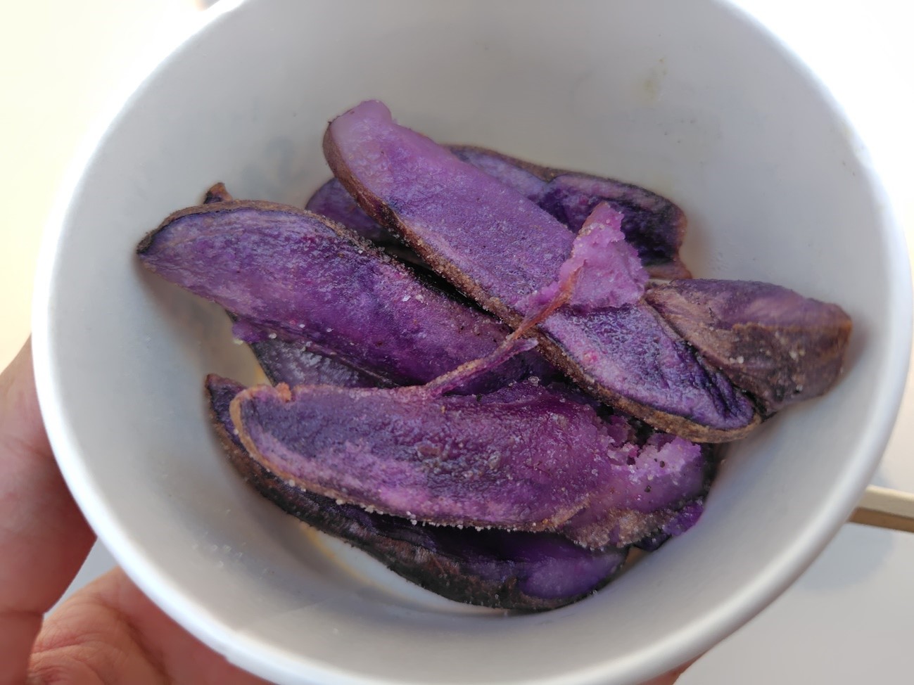 出来上がった商品はバイオレットフレンチフライ・レモン塩です。いわゆる、紫ジャガイモのフライドポテトです。