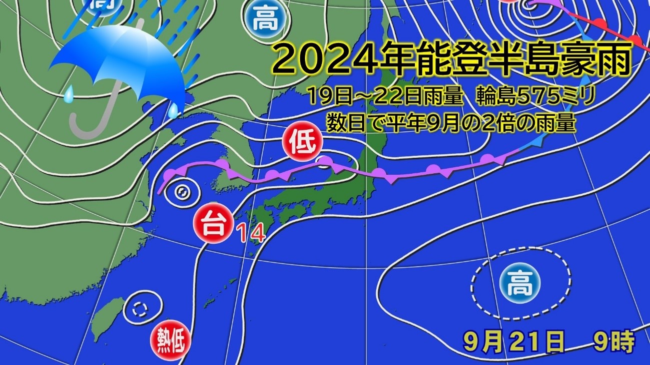 昨年9月19〜22日頃にかけて能登半島で記録的豪雨となりました。この原因となったのがまさに秋雨前線と台風です。