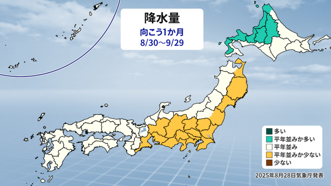 では、気象庁発表の1か月予報(降水量)を見てみます。東日本・北日本の太平洋側の地域で平年並みか少ない予想が出ています。深刻な雨不足に悩まれる地域においては、かなりネガティブな予想と言えそうです。