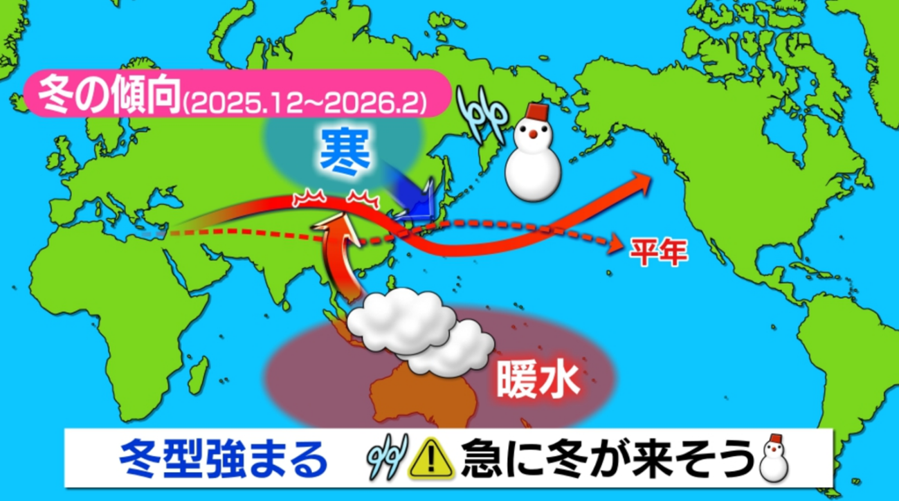 そこでは雲の動きが活発で、雲から流れる空気が冬の偏西風を蛇行させてしまいます。日本は、平年よりも強い寒気が流れ込みやすい状況となり、急に寒く・大雪となりそうなのです。