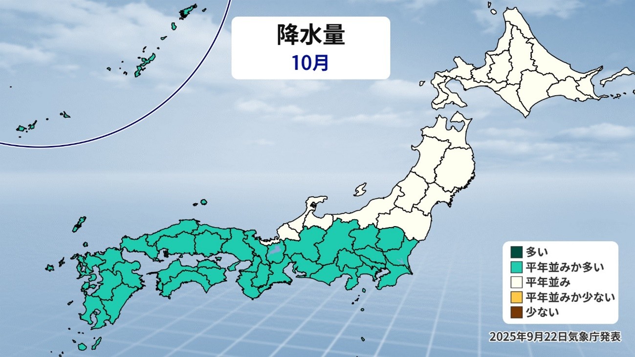では、雨はどうでしょうか。1か月予報(降水量)を見ていきます。すると東・西日本が平年並みか多い予想となっています。