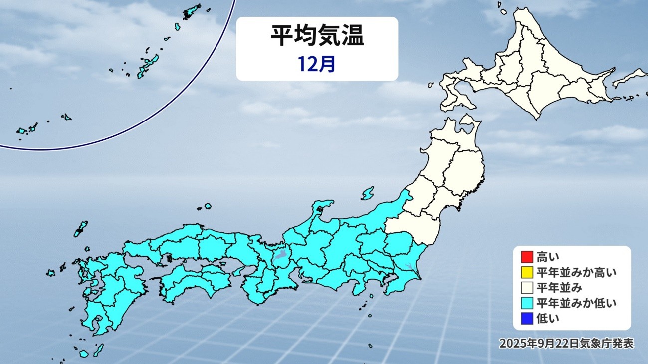 12月に入ると、東・西日本を中心に平均気温は平年並みか低い予想となっています。11月までは暖かい傾向が続く予想ですが、12月に入ると寒気が流れ込み一気に寒さがやってくる予想です。