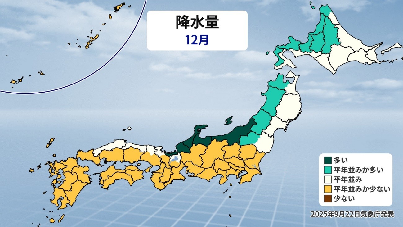 12月の降水量予想です。北・東日本海側で降水量が平年並み〜多い予想となっています。