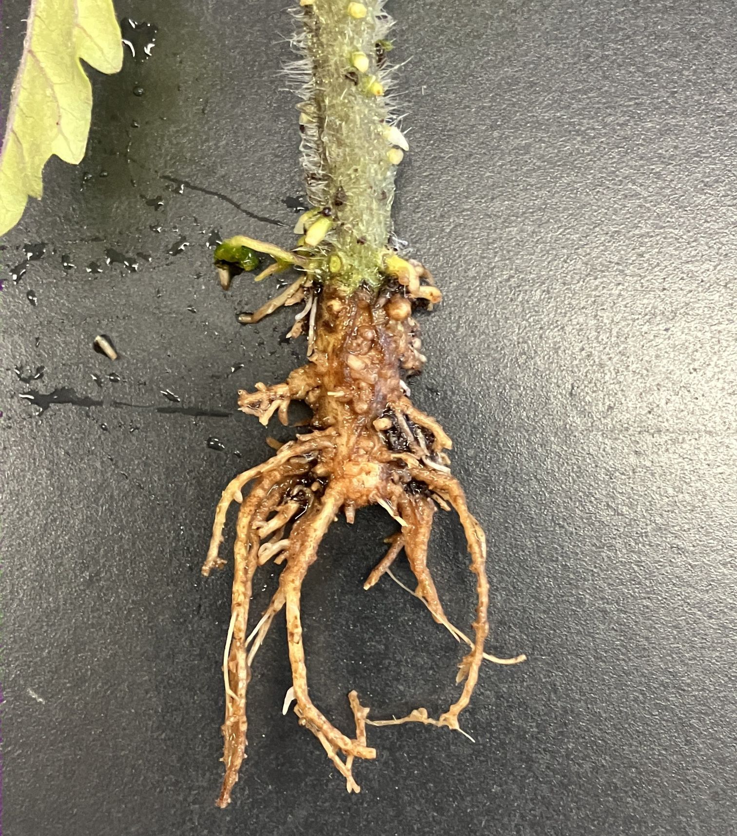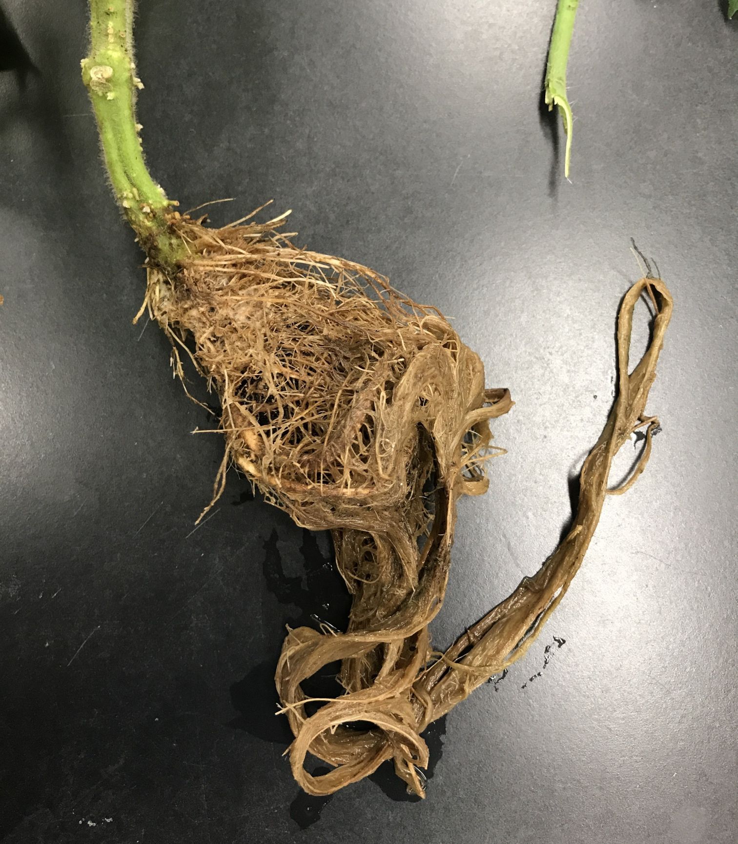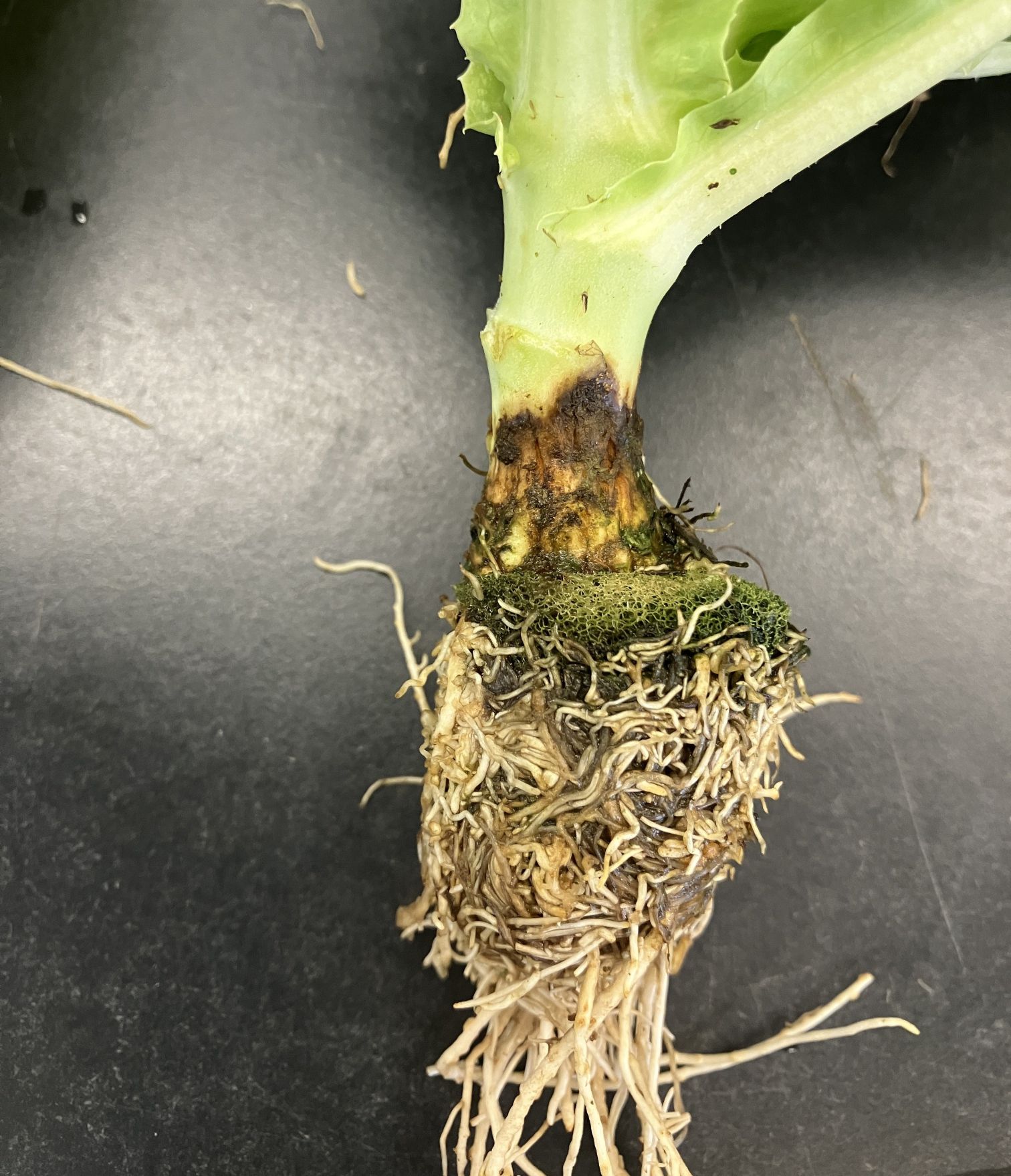 初めに根の一部が褐変し、進行すると根系全体の褐変や腐敗がみられる