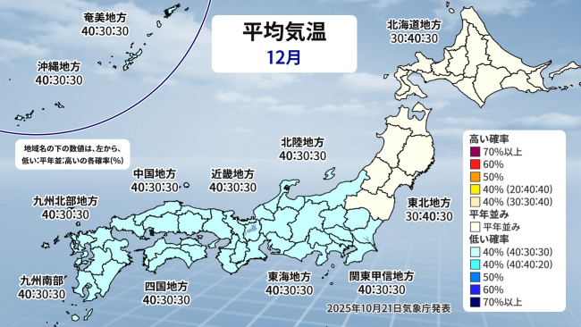 全国的に平年並みの寒さといった所ですが、詳細をよく見ると、東・西日本は低い確率が40%となっています。おおむね12月らしい寒さではあるものの、「若干いつもの12月より寒くなるかもしれない」。というような意味が込められています。