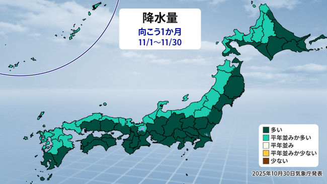 気象庁発表の1か月予報(降水量)を見ると、全国的に「平年並みか多い」、「多い」予想となっています。特に各地とも今月上旬〜中旬頃まで曇りや雨の日が多い傾向となっています。