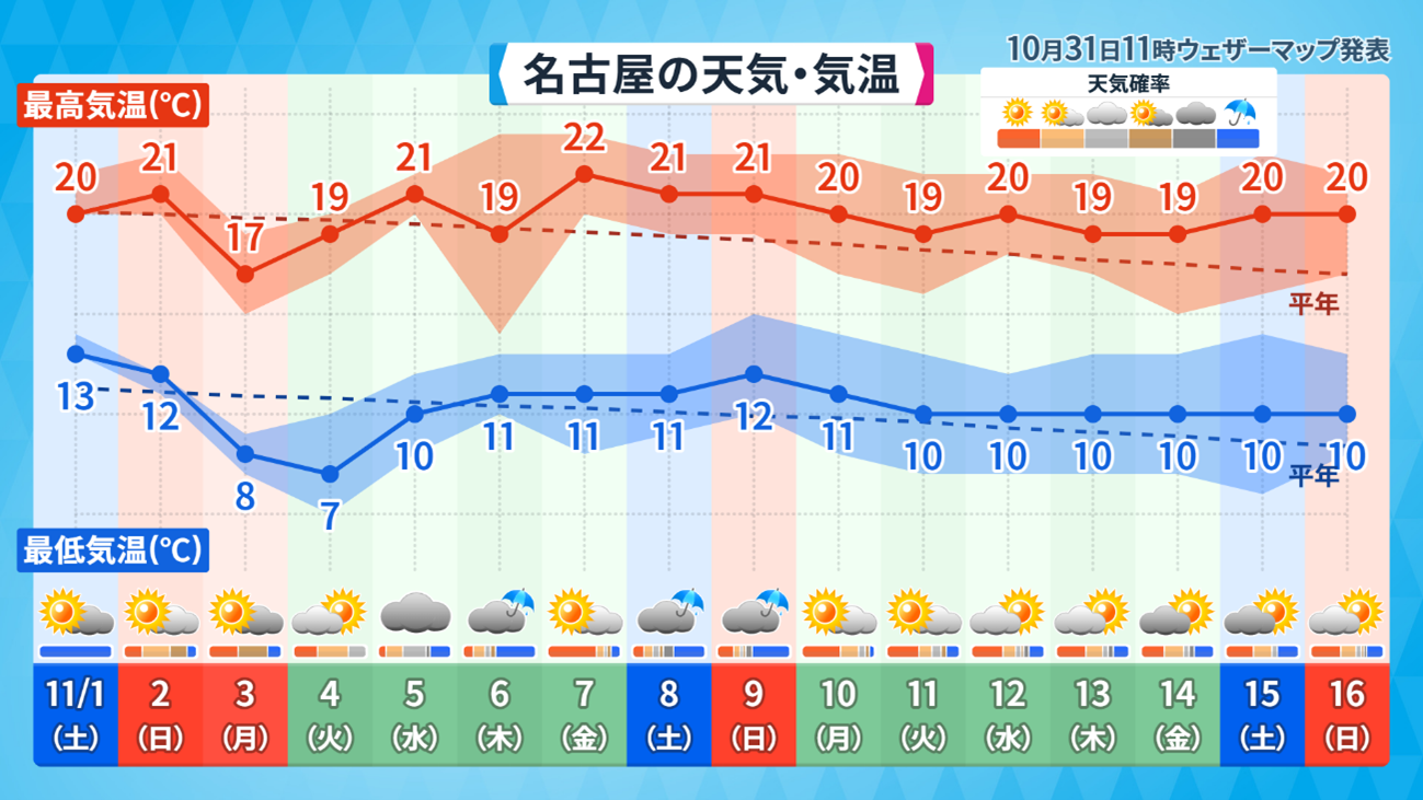 ウェザーマップ独自の16日予報で名古屋を見てみます。最高気温、最低気温とも平年よりやや高く晴れと雨が交互にやってくる予想となっていますね。