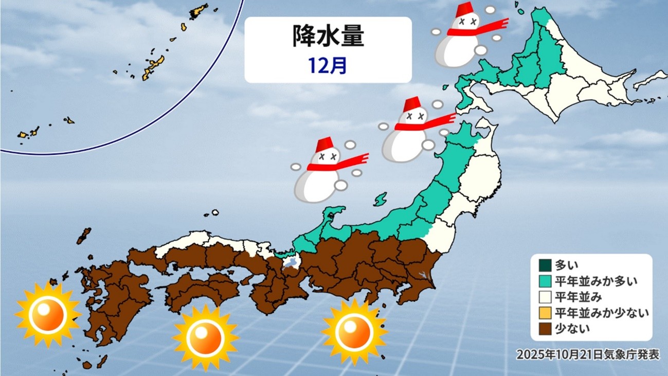 一方で、東・西日本の太平洋側は茶色で晴れて乾燥する日が多くなる予想です。寒さが増す一方で、冬特有の乾燥した強風が吹くため火災が発生しやすくなります。農作物の管理のため暖房を使うと思いますが、火の取り扱いには注意が必要です。
