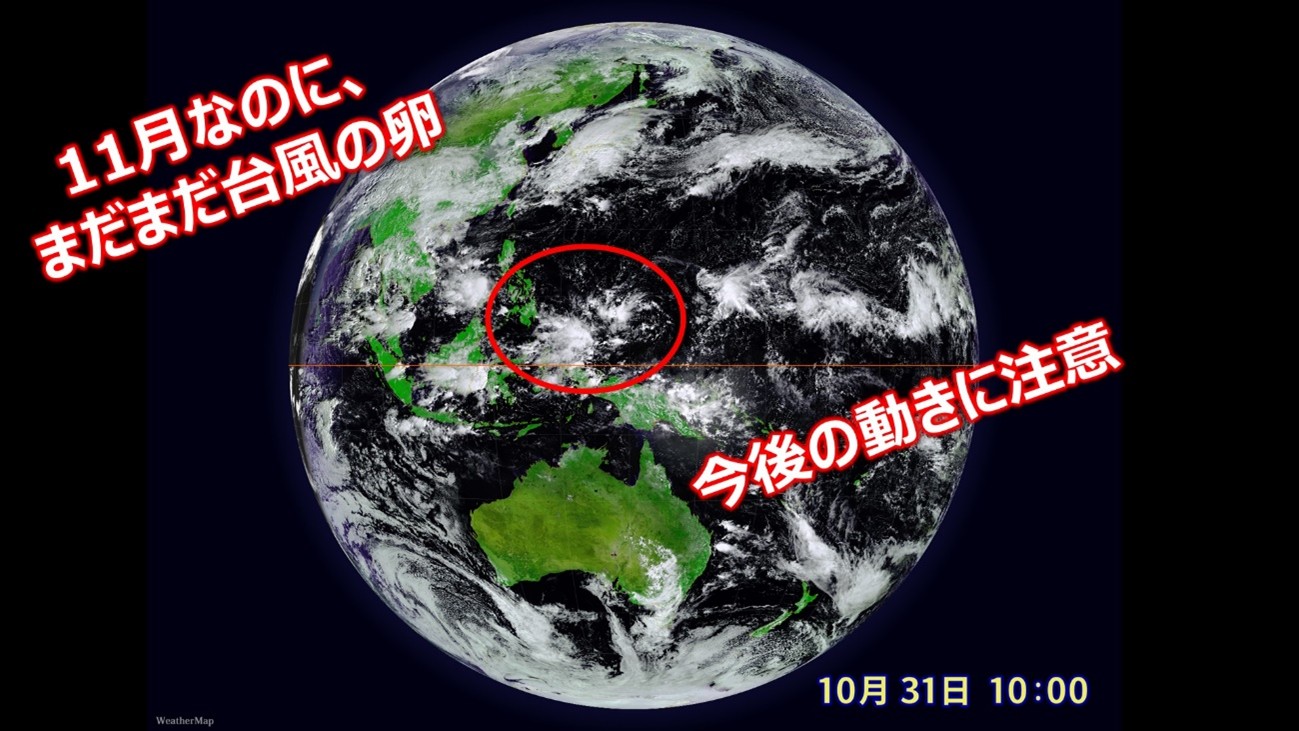 実は11月だというのに、まだまだ日本の南に台風の卵らしき物ができています。平年、11月に入れば海面水温は下がり台風の発生・日本への接近は減少します。しかしながら地球温暖化の影響により今年の台風の動きはしつこいです。