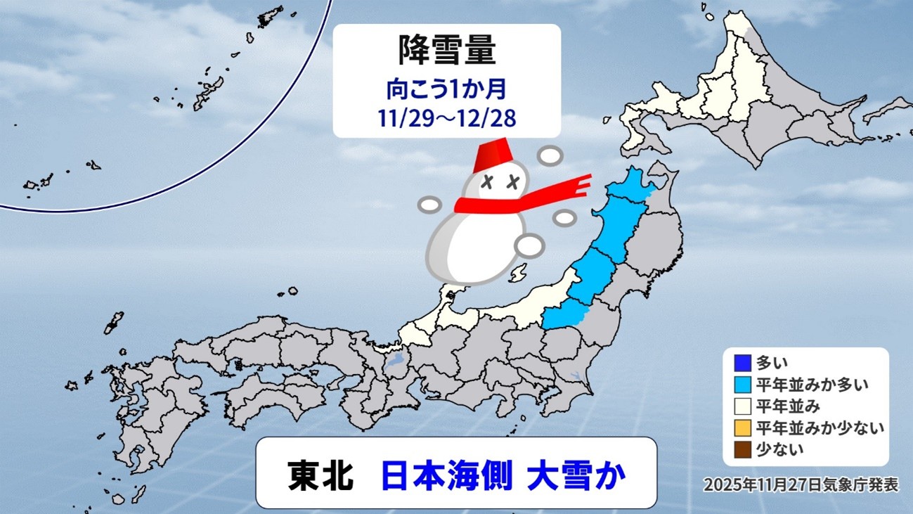 続いて、1か月予報の降雪量を見ていきます。東北で平年並みか多い予想となっています。