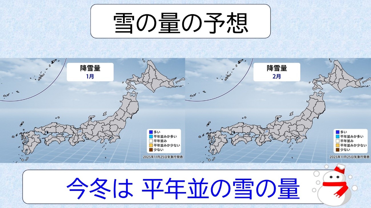 今回は、さらに来年の雪の見通しもみてみましょう。気象庁は1月・2月と全国的におおむね平年並みの雪の量を予想しています。
