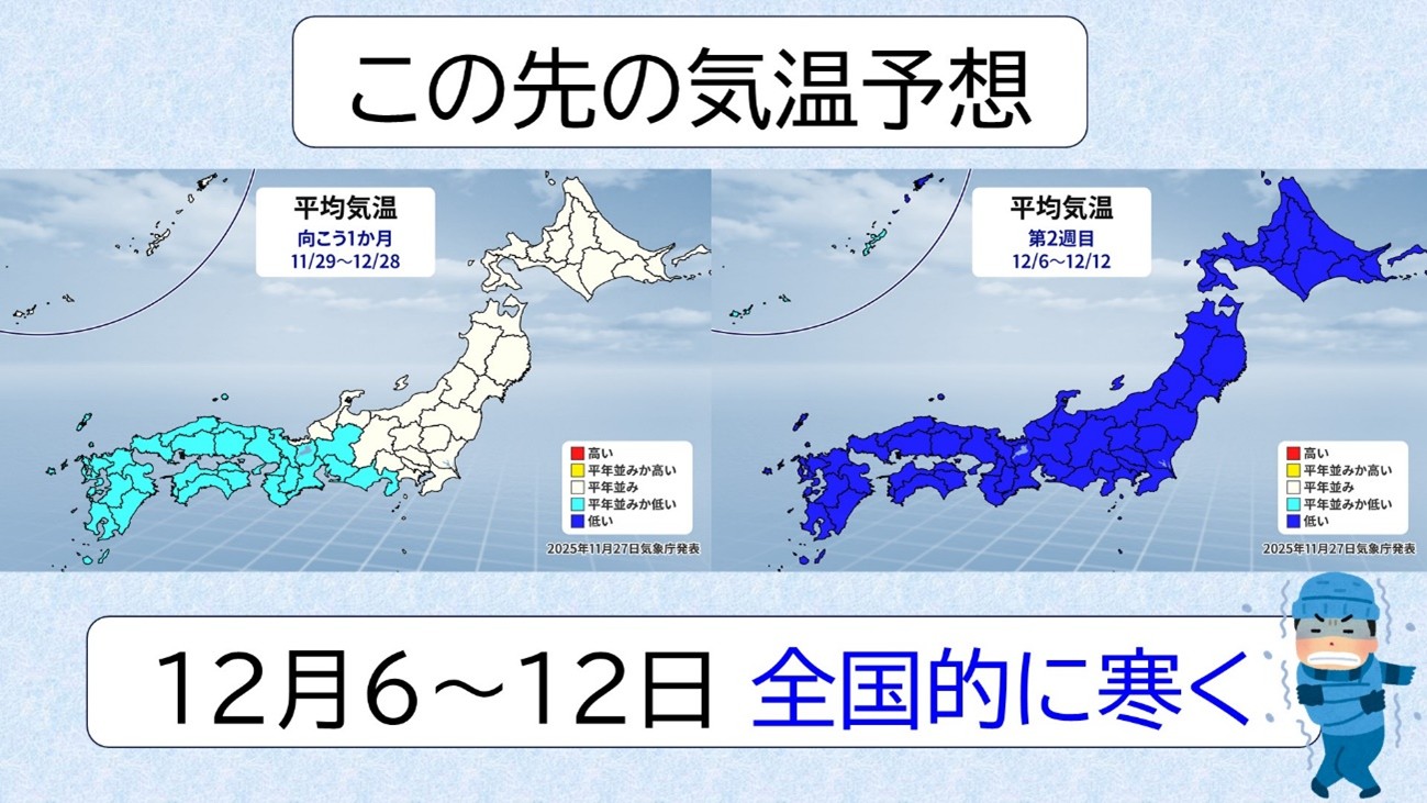 もう少し詳しく見てみると12月6日(土)〜12日(金)にかけては本州全域で平年より気温が低いとなっており全国的に寒くなるのではないかという予想です。日に日に寒さが増していきそうです。