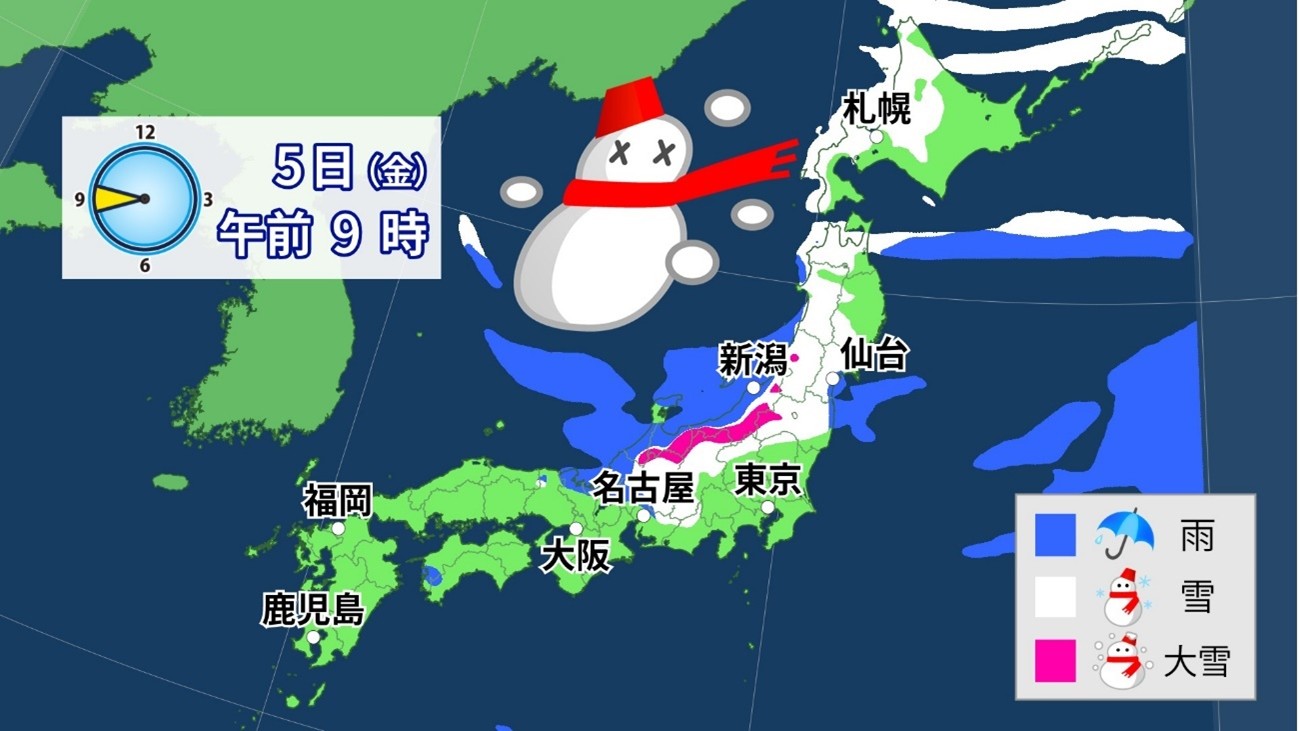 さらにこちらは5日(金)午前9時のスパコンの雪の計算です。白い表示が雪、ピンク色は大雪のおそれのある所です。