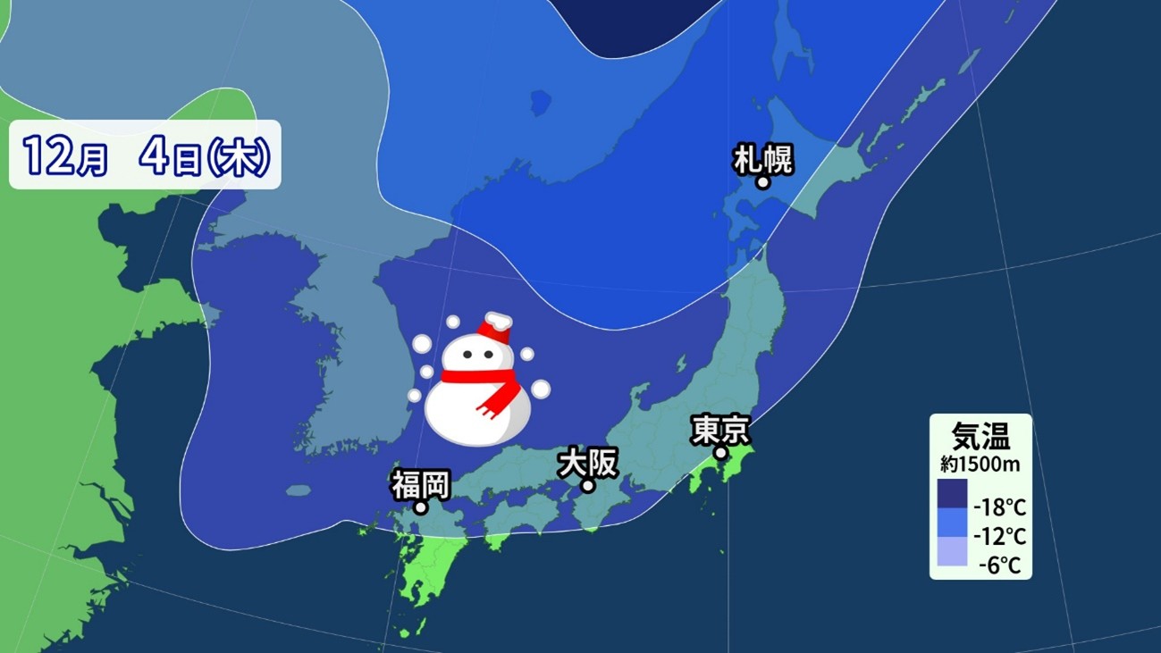 4日(木)には平地で雪を降らせる目安の寒気が福岡あたりまですっぽり覆う見込みです。普段から雪に慣れているような地域であればこの時期らしい雪の量にとどまるかなというレベルの寒気ではあります。