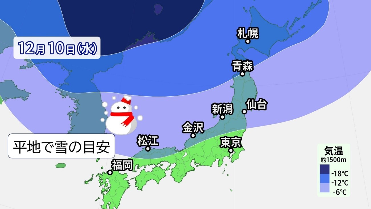 また、10日(水)の上空の寒気の予想を見てみると、再び寒波がやってきそうです。まさに一難去ってまた一難。これも再び平地で雪となる目安の寒波が本州を覆う予想。青森や北海道はもう少し強い雪が降る可能性が高いです。