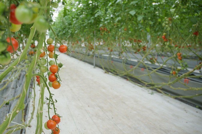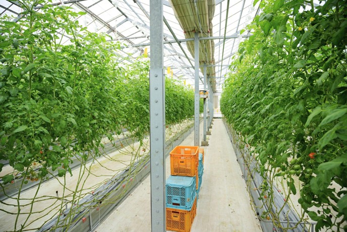 一見、無機質な鉄骨の柱ですが、これにより元々低かったハウスを高くし、トマトにとって最適な生育環境を構築しています。