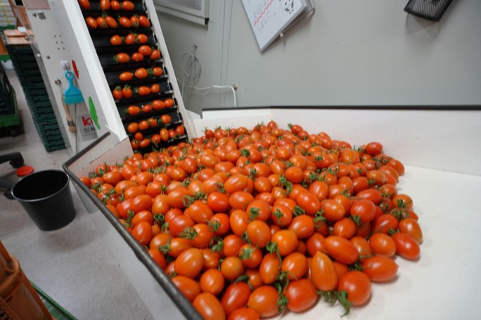 選果機にあふれる採れたてのミニトマト。真岡市のふるさと納税の返礼品としても人気の一品。