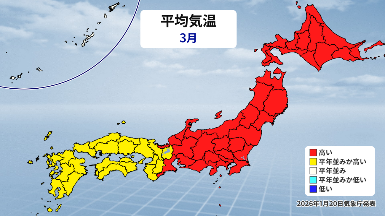 気温はどうでしょうか。3月の平均気温の予想も見てみましょう。すると北・東日本で高く、西日本も平年並みか高い予想です。