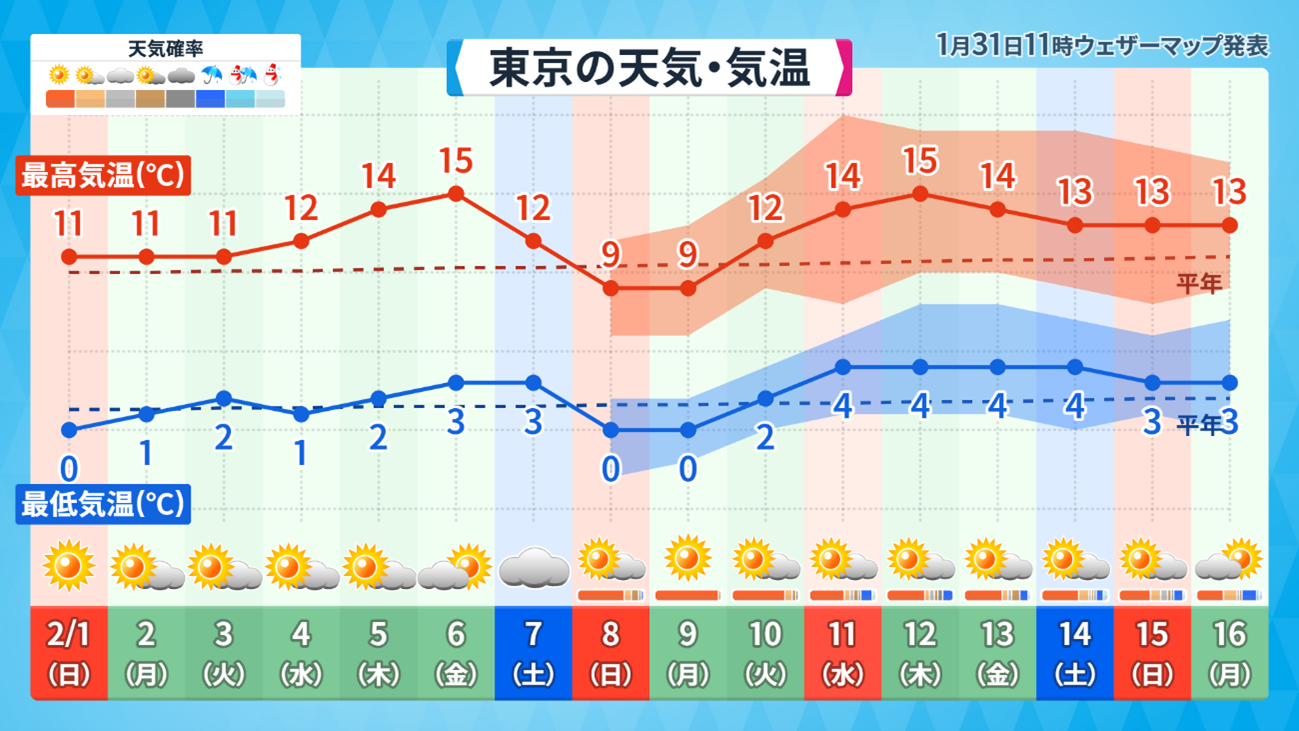 ウェザーマップ独自の16日予報を見てみると、東京の7日が曇りマーク。雨が降るか降らないか微妙ですね。その先もやはり晴れマークが目立ちます。気温のアップダウンもやはり大きくなりそうです。