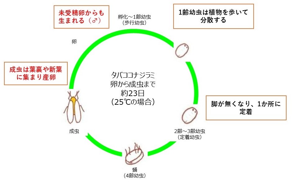 成虫は体長約1mmと小さく、温暖で乾燥した環境を好み、ハウス栽培のような密閉空間では急速に増殖します。