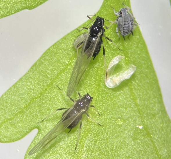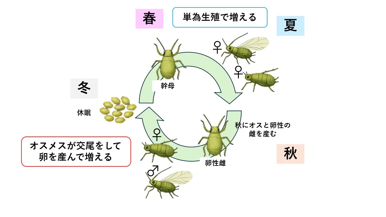 アブラムシ類は多くが単為生殖(無性)で増殖し、温度・日長・密度に応じて有翅種が出現、圃場間・ハウス間を短期間で移動します。