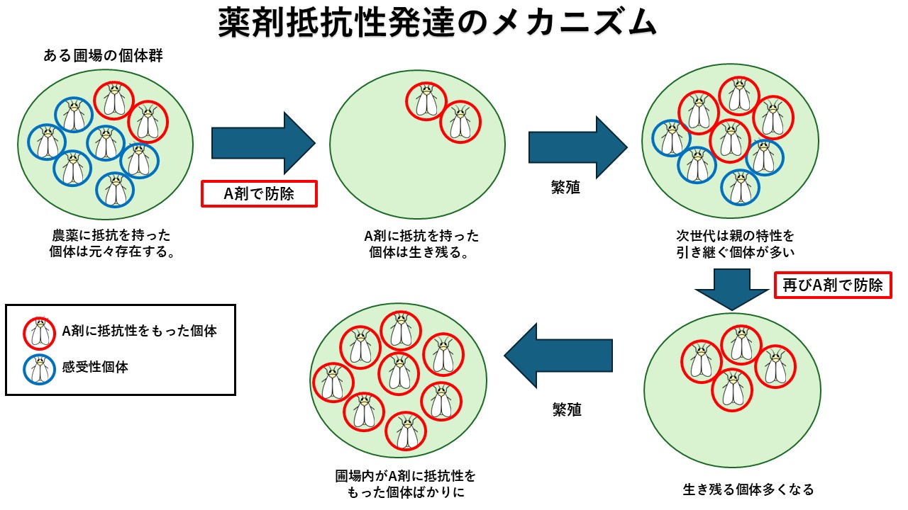 農薬散布を通じて、圃場内の害虫個体群のうち、これらの抵抗性遺伝子を持つ個体が選抜され、その子孫の割合が増加することで薬剤による死亡率が低下します。