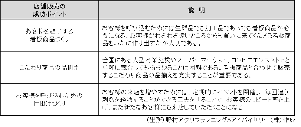 今回、店舗販売の成功ポイントとして、①お客様を魅了する看板商品づくり、②こだわり商品の品揃え、③お客様を呼び込むための仕掛けづくりの3点を挙げたい。