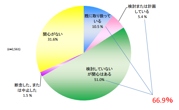 日本政策金融公庫が、平成 28 年7月に実施した「平成28年上半期食品産業動向調査(特別設問)」では、食品関係企業(製造業、卸売業、小売業、飲食業)の66.9%が機能性表示食品の取扱いに関心を持っている回答しました。