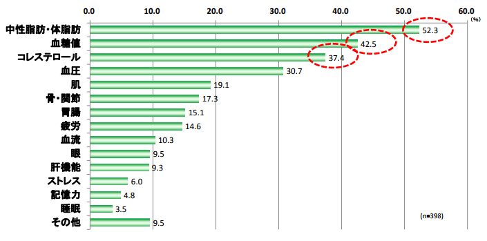 また、関心の高い機能性として「中性脂肪・体脂肪」、「血糖値」、「コレステロール」、「血圧」の効果を狙いとする傾向が高くなっています。
