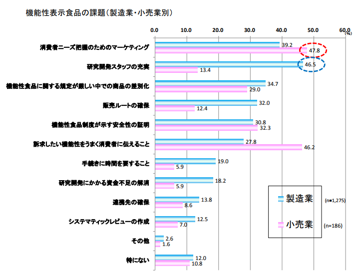 ついて、製造業では「研究開発スタッフの充実」が46.5%と最も多くなっている一方で、小売業では「消費者ニーズ把握のためのマーケティング」47.8%、「訴求したい機能性をうまく消費者に伝えること」46.2%が多い結果となっています。