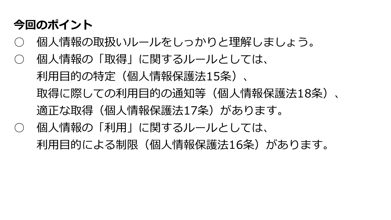 不正な方法とは、例えば、個人情報保護法で定められた個人データの提供のルールに違反して提供するように強要したり、本人をだましたりすることです。さらに、不正な方法によって取得された個人情報であることを知りながら、あるいは簡単に知ることができたにもかかわらず、そのまま個人情報を取得する行為も不正な方法に当たりますので、個人情報を取得する際は、自分が取得しようとしている情報が不正な手段で取得されたものでないかについても注意するようにしましょう。