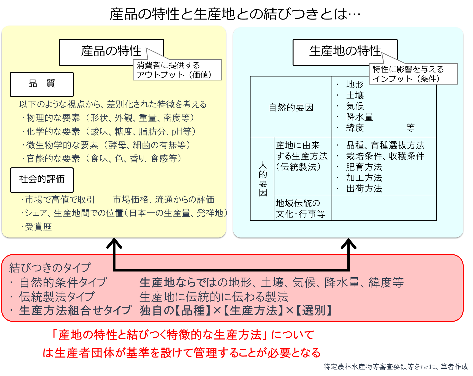 農林水産省のウェブページで公表されている地理的表示保護制度の審査要領(http://www.maff.go.jp/j/shokusan/gi_act/process/pdf/doc10.pdf)では、生産地・生産の方法と特性との結び付きがある場合として、3つのタイプを例示している。