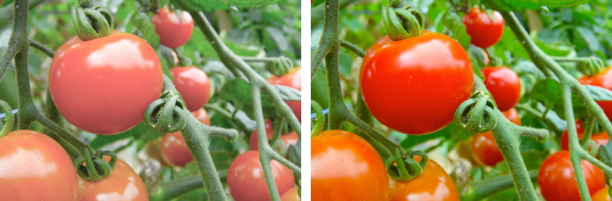 彩度とは鮮やかさのことです。写真を撮った時、実際よりも少しくすんでたりしませんか?ここにあるトマトはとても鮮やかで美味しそうなのに写真ではなぜかその鮮やかさが伝わらない。そんなときに撮影した写真の彩度を調節してみてください。