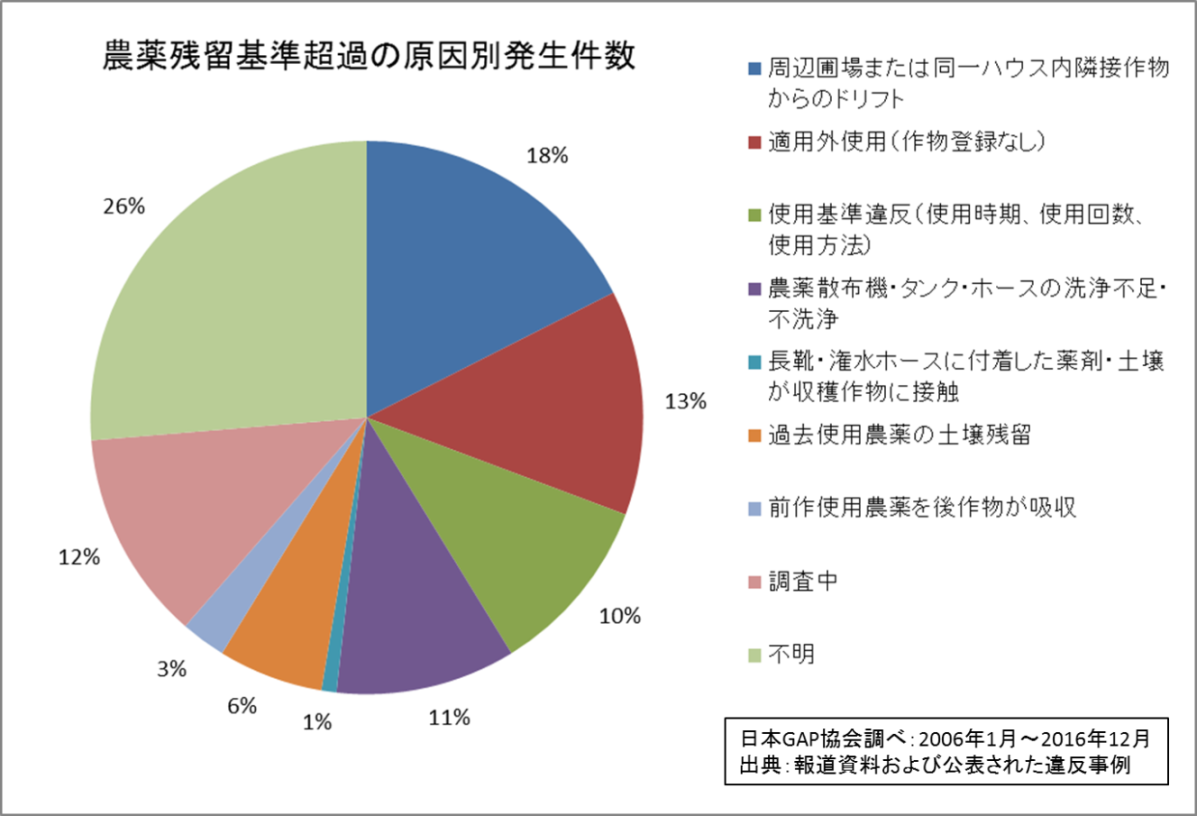 農業者には守るべき各種法律(食品衛生法や農薬取締法など)や行政指針(農薬の飛散防止対策など)がありますが、GAPとはこれら法律などを順守するために日々の農作業・農場管理の仕事の中で“押さえるべきポイント”をまとめた農場管理の基準です。例えば、食品衛生法には野菜の種類ごとに農薬成分ごとの残留基準が定められていますが、その基準を守るために一連の農作業の中でどこを押さえるべきかは書かれていません。図1は都道府県が公表している過去の国産農産物の残留農薬基準違反の事例の統計ですが、農薬のドリフトや散布機の洗浄不足など、農薬取締法や履歴記帳運動だけではカバーしきれていない原因が並んでいることがわかります。GAPの農場管理基準には、これらの原因となる不適切な農場管理を防ぐ項目がすべて盛り込まれています。農産物の残留農薬基準違反(食品衛生法違反)は、GAPで対応するというのが現在の農業界の主流です。