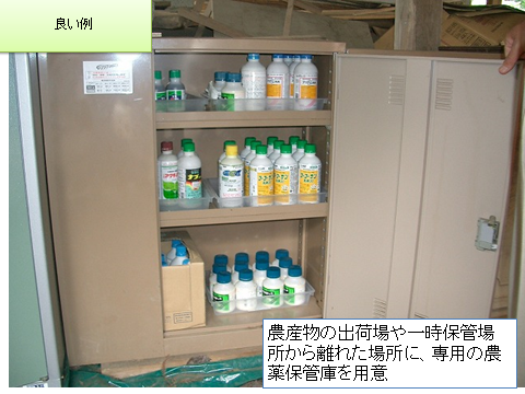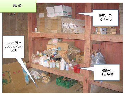 日本の業界標準GAPであり、農林水産省が認めている国際水準GAPの一つである「JGAP」を例に見てみましょう。JGAPの基準書は日本GAP協会のホームページ(http://jgap.jp/)で見ることができます。ぜひ一度実物を見て頂きたいのですが、GAPは図2のような冊子の形になっており、食品安全や環境保全や労働安全を守りながら農産物を生産するために“最低限押さえるべき農作業・管理のポイント”をまとめたものです。例えばJGAPの中には「農薬は出荷の作業場に置かず、専用の保管庫を用意する」とか、「農薬の散布後に、散布機を洗う」などの項目が並んでいます。これらは自分の農場やJA生産部会から残留農薬基準違反を出さないために必要な管理ですが、意外と出来ていない農業者が多い実態があります。農薬の散布機を洗わなかったために実際に残留農薬基準違反は起きており、商品回収や出荷停止など産地が受けるダメージは相当なものです。野菜は食品ですから、農薬の保管場所と同じところで選別するというのは決して良い管理ではありませんし、消費者がもしその場面を見たらびっくりするでしょう(図3と図4)。地域を代表する篤農家の方に言わせれば「当たり前」のことでも、若手の農業者や、農薬の知識が不足している農業者の方もおり、産地みんなでGAPに取り組むことで事故を未然に防ぐことができます。