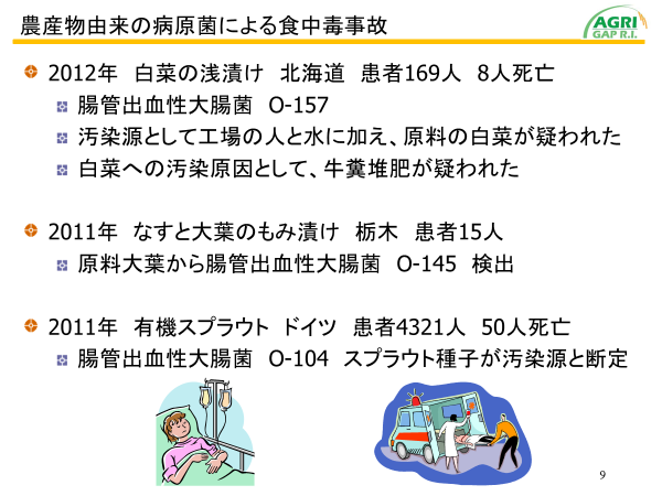 病原性大腸菌O-157やノロウイルスという食中毒原因菌の話は聞いたことが有るでしょう。農産物由来の食中毒事故も図5のように実際に起きており、死者も出るほど深刻です。JGAPの基準書には、これらの問題を起こさないための“最低限押さえるべき農作業・管理のポイント”が含まれており、自分の農場から食中毒事故を出さないために有効です。残念なことに、日本で普及しているGAPの中には(JGAP以外にも日本にはGAPがあり、次号以降で詳しく取り上げます)、残留農薬の話だけで終わっているものもあり、不十分と言わざるを得ません。