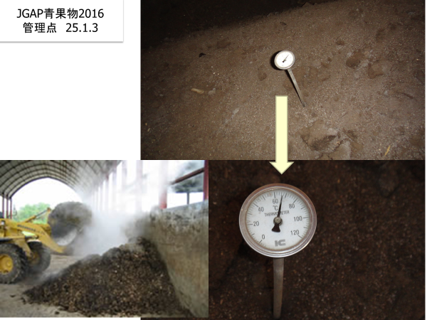 日本で最も多く使われている堆肥が牛糞堆肥です。原料である牛糞には病原性大腸菌O-157が含まれている可能性が多い地域で3割あると言われています。図6のように、しっかり好気性発酵が進むと発酵熱で70度以上になり、病原性大腸菌は死滅します。しかし、発酵が不十分な牛糞堆肥も農業現場で使われており、また発酵前の牛糞堆肥にふれた作業員が同じグローブで野菜の収穫・出荷に当たるケースもあり、病原性大腸菌の汚染経路になっている可能性があります。JGAPを導入している農場では、収穫前の手洗いや収穫専用のグローブを用意しており、このような心配はありませんが、多くのGAP未導入の農場ではリスクの高い状態になっているかもしれません。