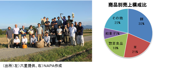 "株式会社六星の売上高は約11億8,000万円(2017年3月期:見込)であり、主力商品は「米」である。しかし、売上構成比を見てみると、餅32.0%、米21.0%、惣菜食品18.0%、和菓子7%、その他22.0%となっており、主食用の米よりも、加工品である餅の売上比率が高くなっている。また、販売先別に見ても、直営店50.4%(4店舗)、卸39.4%、インターネット通販・その他10.2%とバランスとのとれた売上構成となっている。当社の商品となる米や加工するためのもち米は、全て自社で栽培している。例えば同じコシヒカリだとしても、農薬不使用の「特上コシヒカリ」、減農薬減化学肥料の「六星コシヒカリ」、「白山米コシヒカリ」と3種を栽培している。また、うるち米の「ハナエチゼン」、「にこまる」や餅の原料となる「白山もち」等、同じ米でも多様なニーズに対応できるようにしている。"