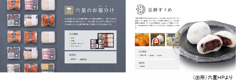 主力商品である餅は、地元の伝統である塩味をきかせた餅で全国的にも珍しく、石川県特有の文化である紅白の丸餅も首都圏で人気が高まっている。しかし、少子高齢化や核家族化等、ライフスタイルが変化する中で、若い人の「米離れ」、「餅離れ」に危機感を抱くようになった。そこで、若者、特に若い女性をターゲットとして美味しいだけでなく、「おしゃれ感」を前面に出した和菓子ブランド「豆餅すゞめ」や、お土産や贈答用の「六星のお福分け」等、斬新なデザインパッケージやコンセプトによって新しい顧客層を開拓している。また、当社は米や餅、弁当やおにぎり、惣菜等を扱う大型店「むっつぼし」や、餅や和菓子を主体とした小型店「すゞめ」等、多様な形態による店舗を展開しており、餅・弁当・惣菜は添加物不使用で、「できたて」にこだわっており、生産者ならではのブランド戦略を展開している。