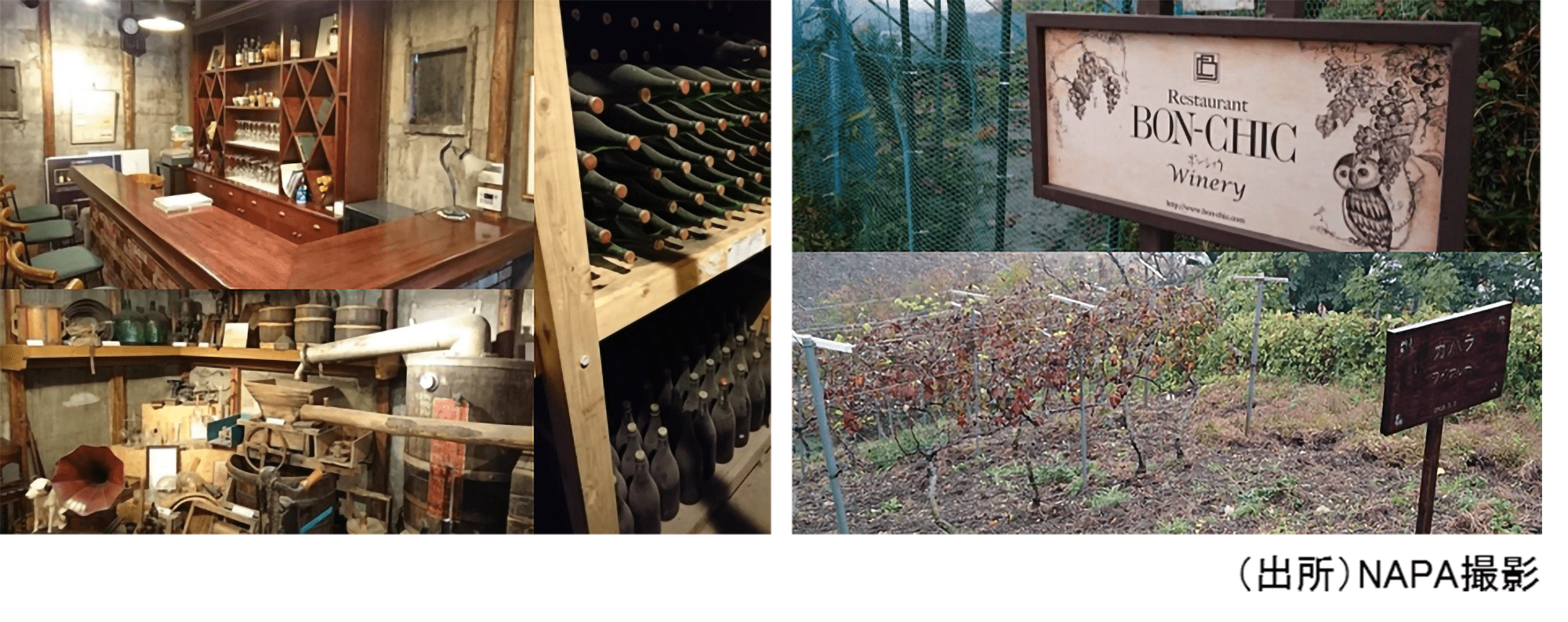 登録有形文化財のテイスティングコーナー(左)とボランティア農場(右)