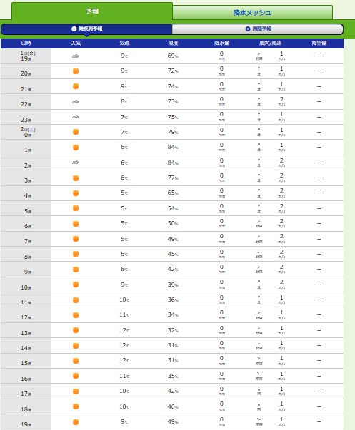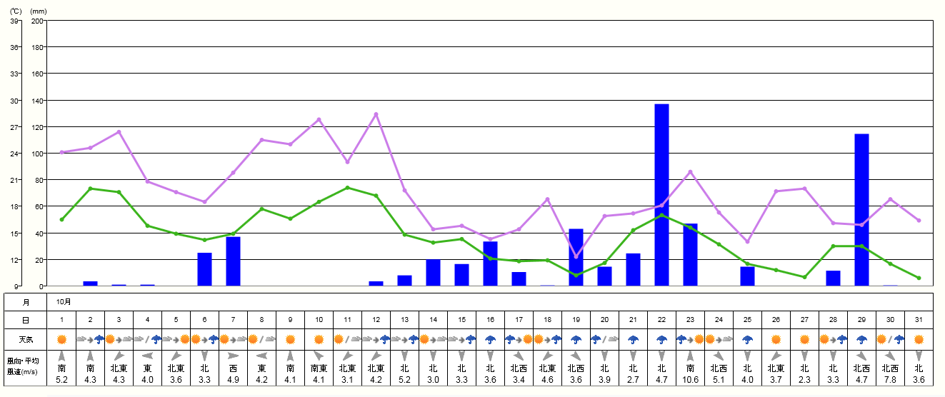 日毎の天気・降水量・最高気温最低気温・平均風速風向